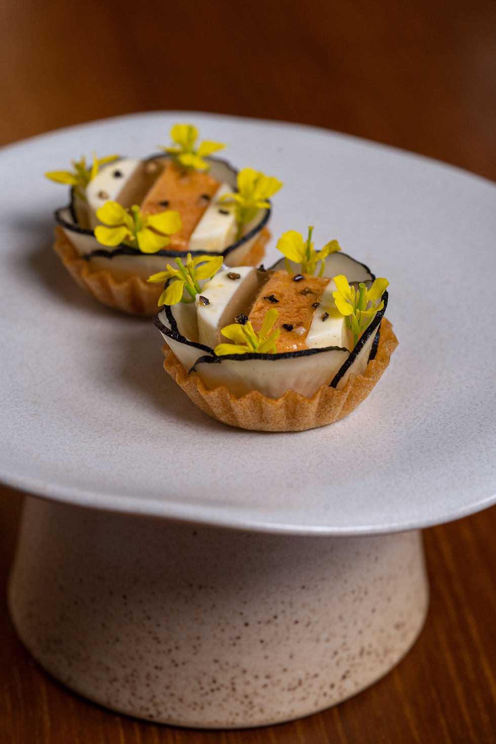 Tartlet of Ankimo, Fragrant Dashi Jelly, Katsuobushi Cream and Salted Radish