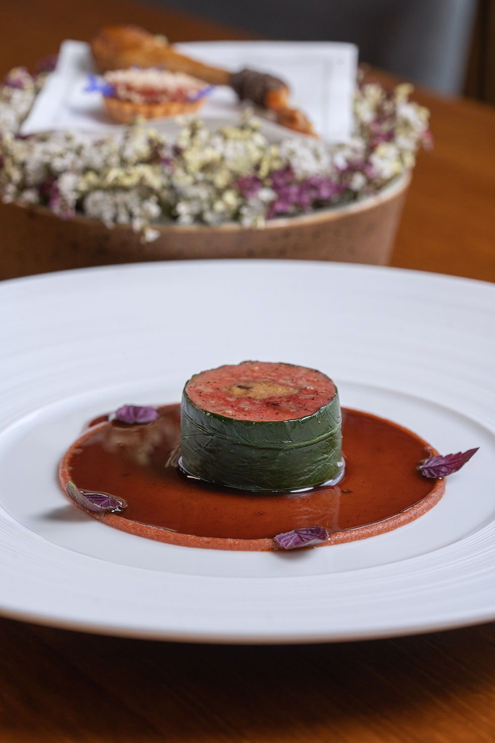 Mieral Pigeon from Bresse cooked with Chestnut Farce and Sauce "Au Poivre"
